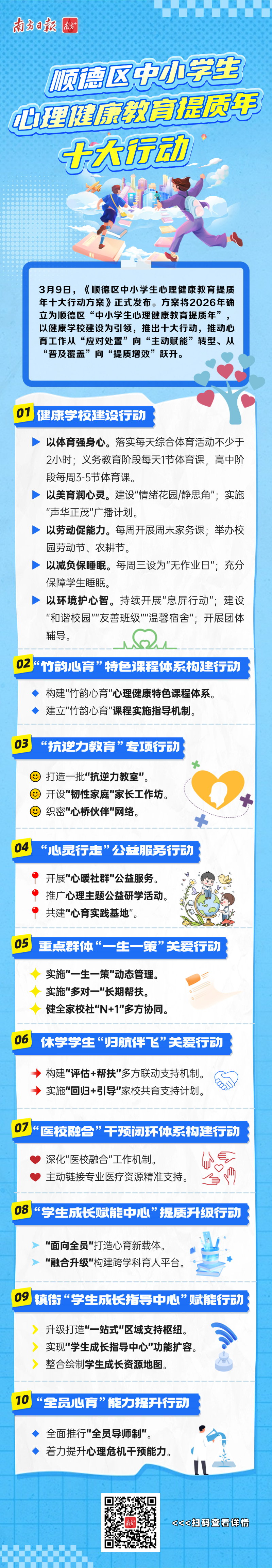 如何竣事?看征服。先说样式这块。顺德将2026年设立为 “中小学生样式健康莳植提质年” 。十大行径,第一是健康学校诞生,包含了学校体育、好意思育、服务莳植、样式健康、近视防控、体重经管、食物安全和生命莳植八项重心任务。顺德条目各学校逐项落实,尤其要将健康理念融入莳植素质全链条,全场合看管学生阳光成长。