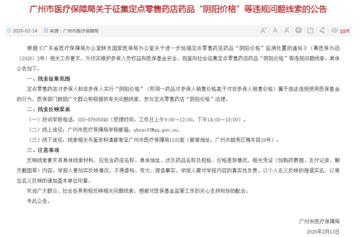 根据《广东省医疗保险局办公室转发国度医保局办公室对于进一步加强定点零卖药店药品“阴阳价钱”监测贬责的见告》(粤医保办函〔2026〕2号)关连职责条款,为切实珍惜参保东谈主员职权和医保基金安全,现面向社会搜集定点零卖药店药品“阴阳价钱”等违法问题陈迹。具体公告如下: