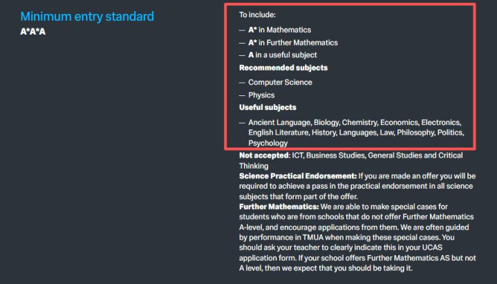 若是是数学与计较机交叉专科,收用条目还会更高。比如 Mathematics and Computer Science MEng 页面泄漏,最低条目为 A*A*A overall, 数学和进阶数学皆条目A*,入学纯熟相同需要 TMUA。