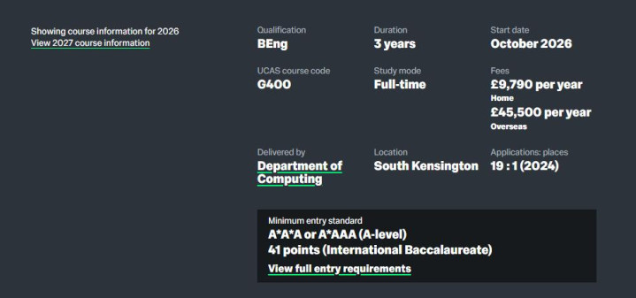 从最新课程页面可查到的收用条目看,帝国理工 Computing BEng 的 A-Level 典型门槛是 A*A*A 或 A*AAA,并条目参加 TMUA(Test of Mathematics for University Admission)入学纯熟。学校在招生端和培养端自身就如故把门槛拉得额外高。