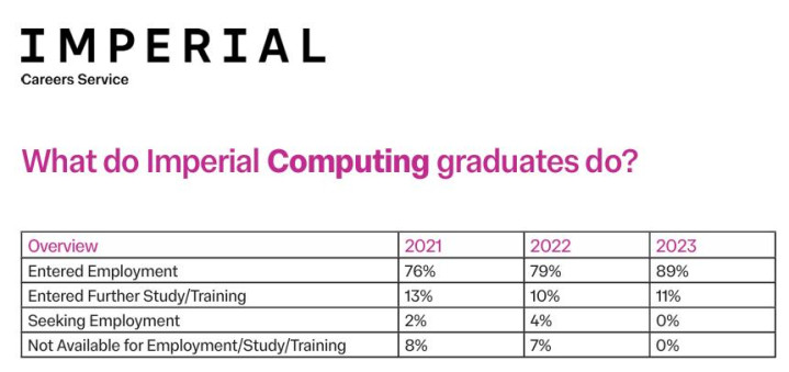 按照帝国理工 Careers Service 发布的统计,2023届计较机本科毕业生中,89%参预办事,11%参预进一步深造/培训,Seeking employment(求职中)为0%。也即是说,在这份官方口径里,莫得东谈主处于“毕业后正在找责任但还没下跌”的情状。