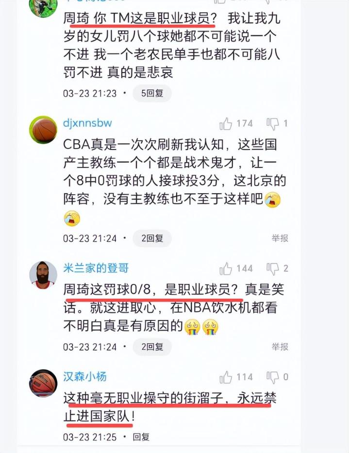 还有东说念主怒批:“拿着千万参加,连最基础的罚球齐练不好,分明即是缺练,缺少职业精神,熟悉混日子。”更有球迷直言,周琦如今的情状,即是街溜子式的进展,拿着高薪,却不付出相应的戮力,环节时刻掉链子,坑惨整支球队。