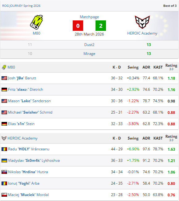 这场失利对M80代价惨重——其正本较高的Major晋级概率因此下滑。负于赛前VRS排行第115位的HEROIC青训,导致他们在积分榜上跌落三位,更错失了在瑞典赛事中积蓄更多积分的良机。