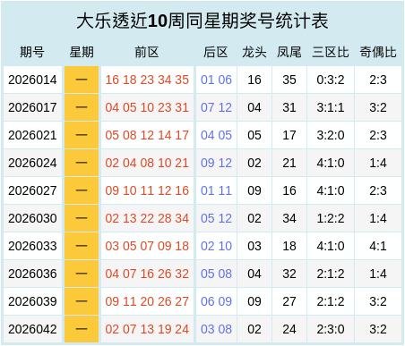 龙头凤尾分析:上周星期一的龙头号码为02,属于偶数,凤尾号码为24,属于偶数。
