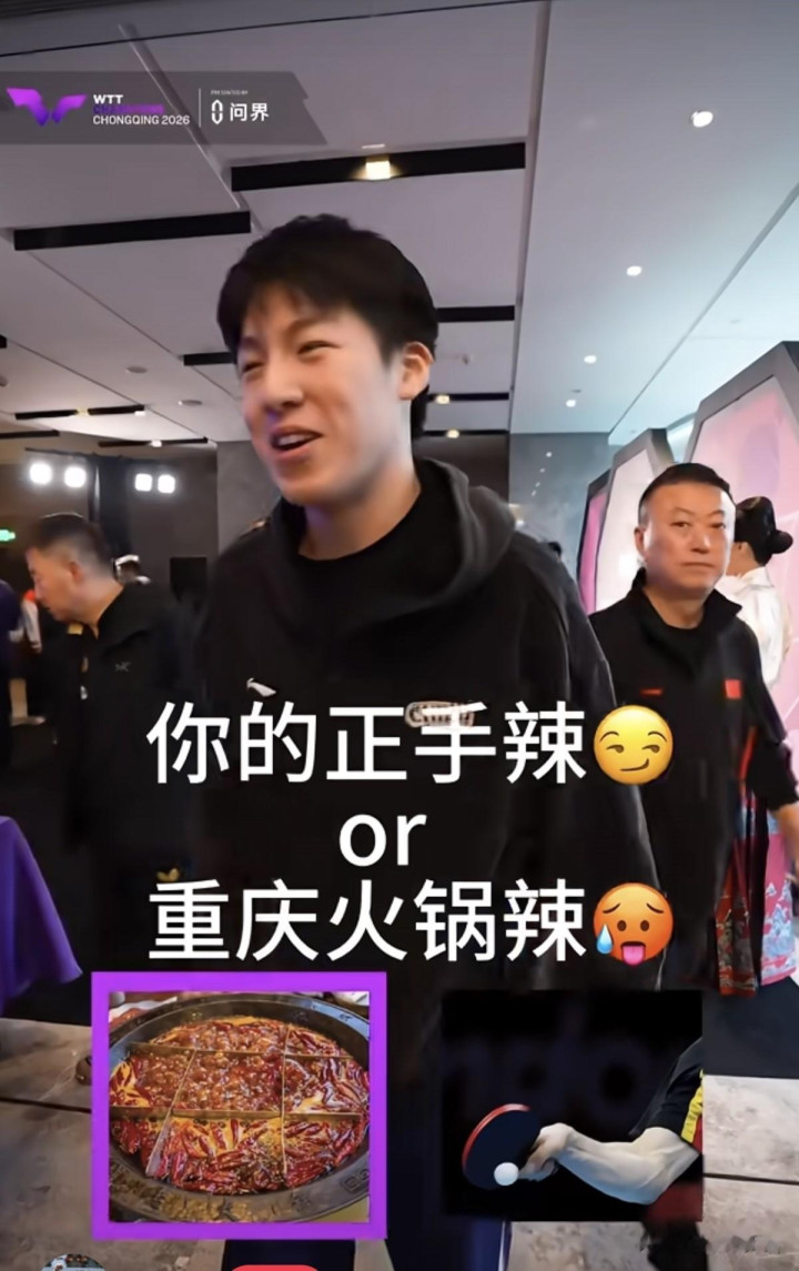 昨晚王楚钦也回复了暖锅和正手哪个辣的问题,他也接受暖锅,看到暖锅就念念到王楚钦说吃暖锅必点的一谈菜是肉,多样肉。王楚钦走在前边,看到背面的牛冠凯拿入部下手机在拍了,寰球说期待牛冠凯发的重庆冠军赛Vlog,他的手机里细目许多头哥的镜头了。